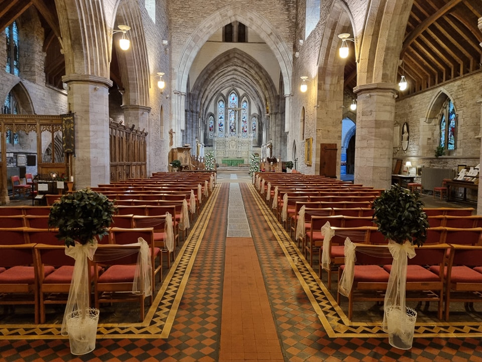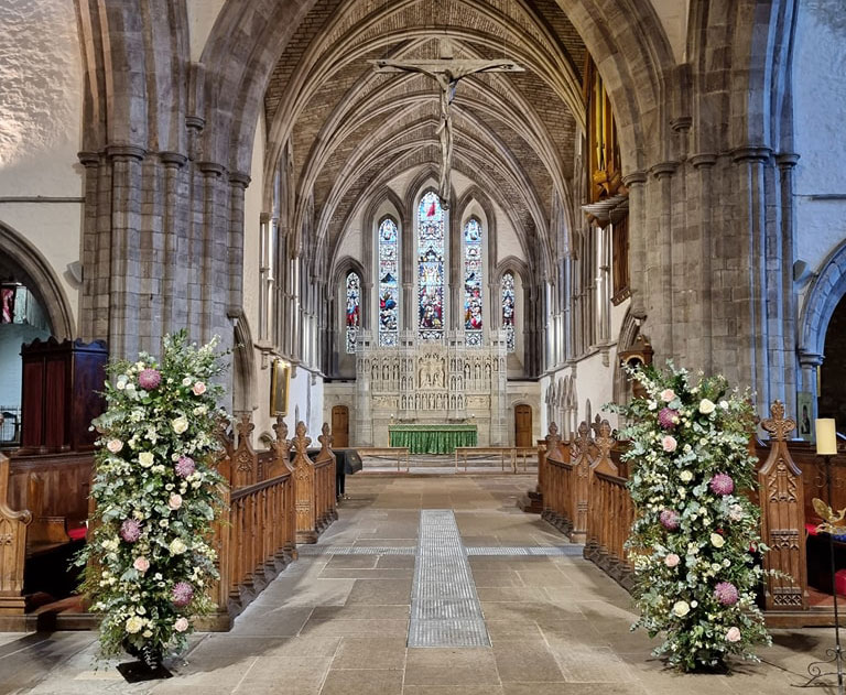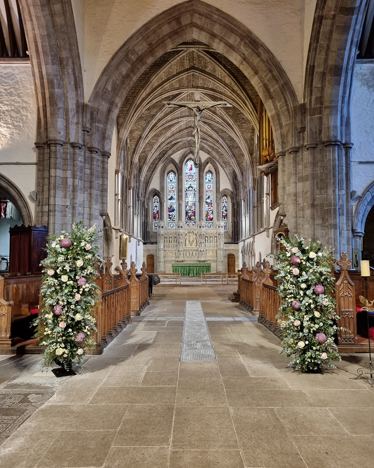 When you have such a beautiful backdrop as Brecon Cathedral, you get the most amazing canvas in which to decorate. At Brecon Cathedral, we had the opportunity to create stunning pillar flower arrangements that enhanced the cathedral's splendor.